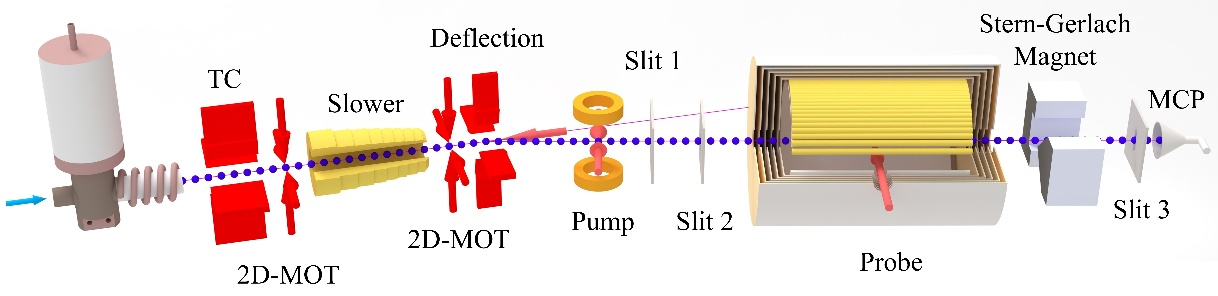 我们在中国科学技术大学搭建了亚稳态氦原子束流装置。该装置结合激光冷却技术,对射频放电产生的亚稳态氦原子进行冷却、压缩、偏转,增强原子束流的强度,并通过光学抽运和梯度磁场实现单量子态探测。