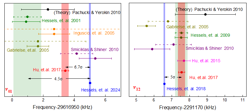 目前氦原子束流光谱主要开展精细结构与绝对频率测定两方面实验。本课题组测定氦-4原子23P0-23P2和23P1-23P2精细结构分裂分别为31,908,130.98±0.13 kHz和2,291,177.56±0.19 kHz,是迄今国际上报道最精确的测量结果之一(如图5所示)。目前该精细结构结果仍未统一,其中加拿大约克大学的Hessels组使用改进的微波方法获取了超高精度结果,但与量子电动力学理论和其他实验结果存在明显偏差。我们未来将进行电离探测等改进,消除量子干涉效应的影响,有望将把原子体系中的α常数测定提高至2×10-9精度。