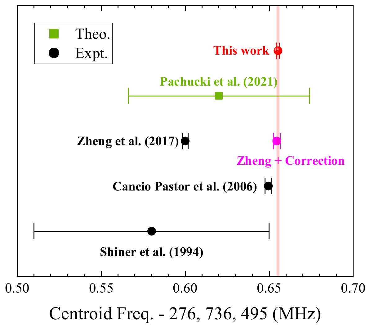 在23S-23P跃迁的绝对频率测量中,采用行波探测方案与变速度测量,我们发现了后选择效应这一系统误差,该效应可导致测量结果偏差超50倍测量精度。我们已将氦-4原子这一跃迁的绝对频率测定亚kHz水平,为国际最高精度结果。未来将在氦-3体系中对同一跃迁进行高精度测量,获取独立的同位素位移结果,并与氦原子其他跃迁以及缪氦离子测定结果相比较,测定氦电荷半径,推动“质子半径之谜”的解决。