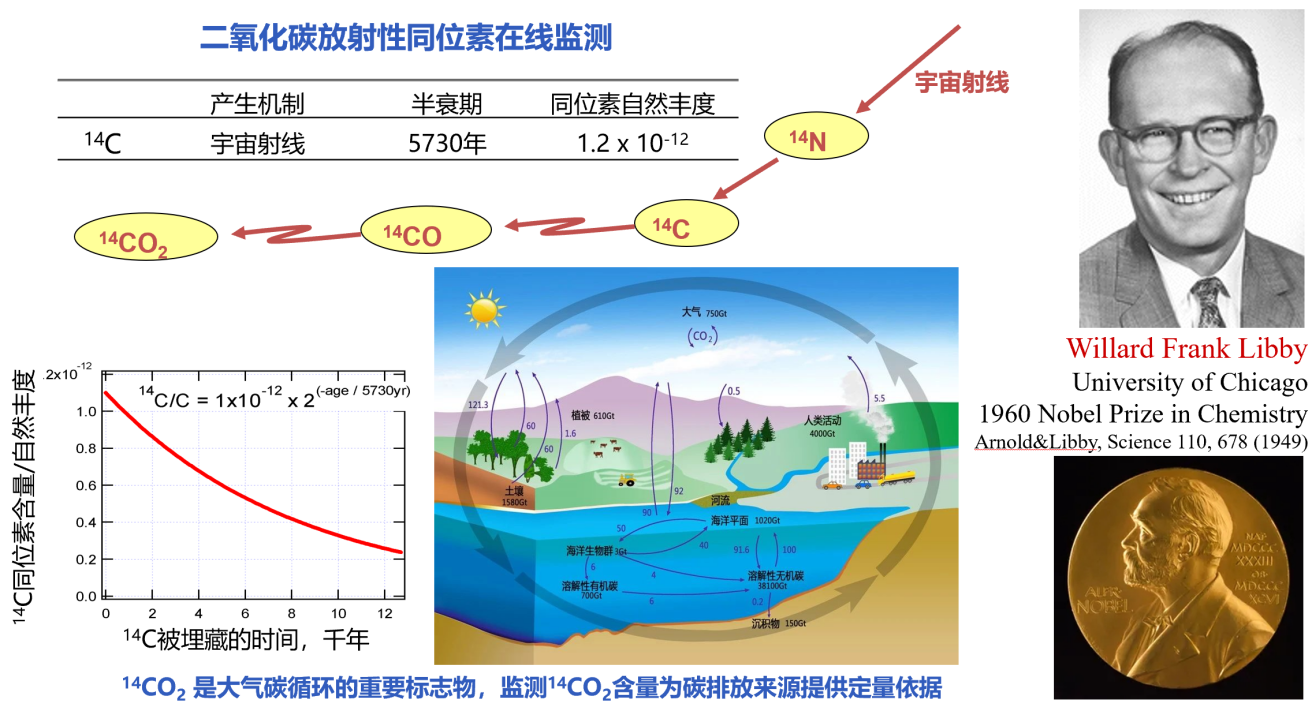 14C是宇宙射线产生的碳同位素(半衰期5730年),因其规律衰变特性被广泛用于地质年代测定。近年来,14C更成为区分碳排放来源的关键示踪剂:化石燃料因埋藏时间极长,其燃烧释放的CO2中已无14C;而生物源CO2(如呼吸、生物降解)仍含自然水平的14C。因此,通过测定大气CO2中14C的含量,即可精确量化化石燃料碳排放的贡献。