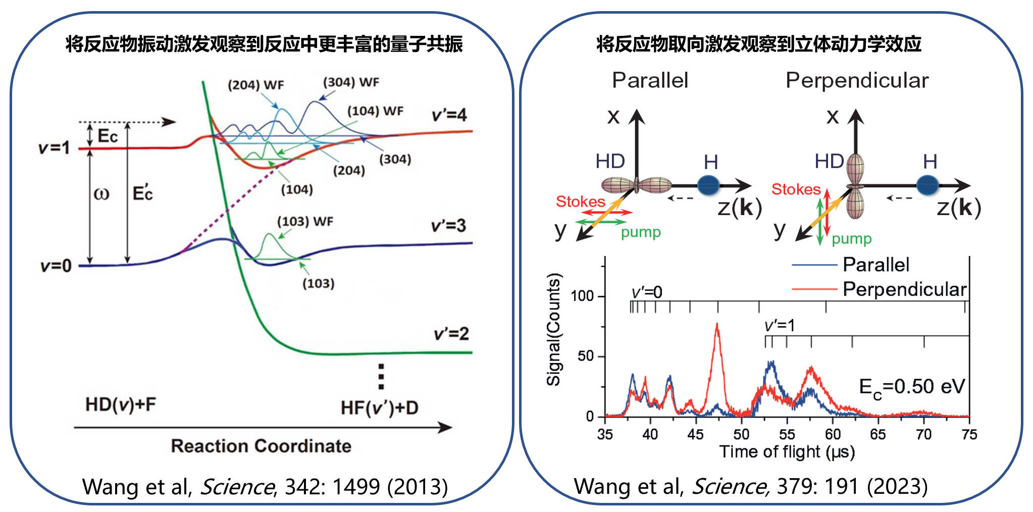 随着化学反应机理研究的深入,人们发现,将分子制备到振动激发态,能够观测到更丰富的量子共振现象,如图1所示,这些共振态只能通过反应物的振动激发,而不能通过平动能的增加来经历。这些研究表明对于化学反应,分子振动激发不仅提供能量,也能开启新的反应通道,从而使我们能观察到在基态反应中所无法观察到的共振现象。最新的研究表明,通过调控量子态,能够控制反应物化学键的方向,实现化学反应的立体动力学精准调控。这些发现的背后,存在一个更有普遍意义的科学问题,这些量子共振和立体动力学效应是否存在于更多的反应体系中?揭示和理解这些效应将帮助我们更加深入地理解化学反应的微观本质。然而,分子的单量子态制备技术极具挑战。对于化学上感兴趣的分子,目前没有很好的分子操控和量子态制备方法。