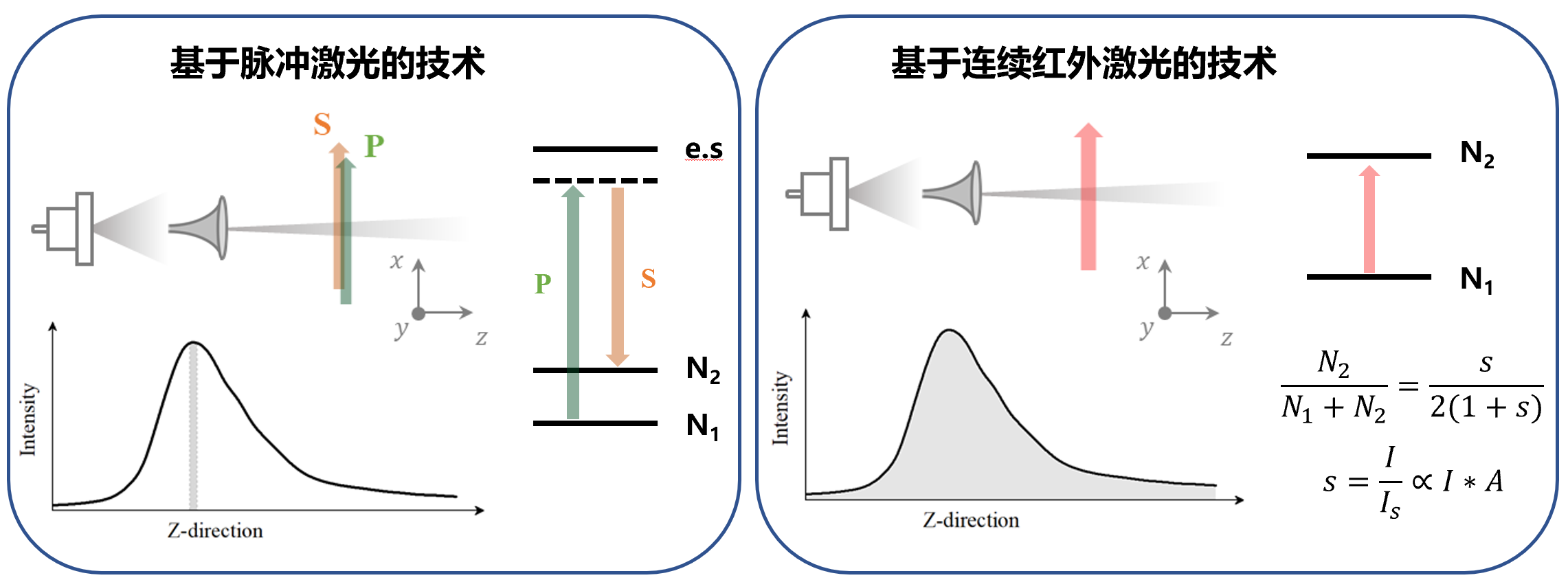 我们提出,可以用精密连续激光实现分子振转量子态的制备。传统的基于脉冲激光的振动量子态制备技术多利用了Raman光谱的原理,如图2所示。脉冲激光能量很高,因而激发效率高,但脉冲光占空比很低,激发态在整个分子束中的占比很低。受限于Raman跃迁的截面,脉冲激发技术目前仅适用于低振动激发态的制备和调控。连续激光与分子束作用,可以实现整个分子束中分子的激发,这种方法通用性比较好,能够适用于大部分分子。但是分子的振动跃迁比较弱,比如分子红外振动跃迁比原子跃迁一般要弱6-8个数量级,要想实现振动量子态高效率的制备,需要千瓦量级的功率,如果要持续激发还需要对激光频率和相位精确控制,这就对光源和激光控制技术提出了更高的要求。通过实验室发展起来的精密激光和光腔增强技术不仅能够精密控制激光的频率和相位,还能够实现激光在光腔内等效功率4-5个数量级的增益,使得分子振动态的高效率激发成为可能。