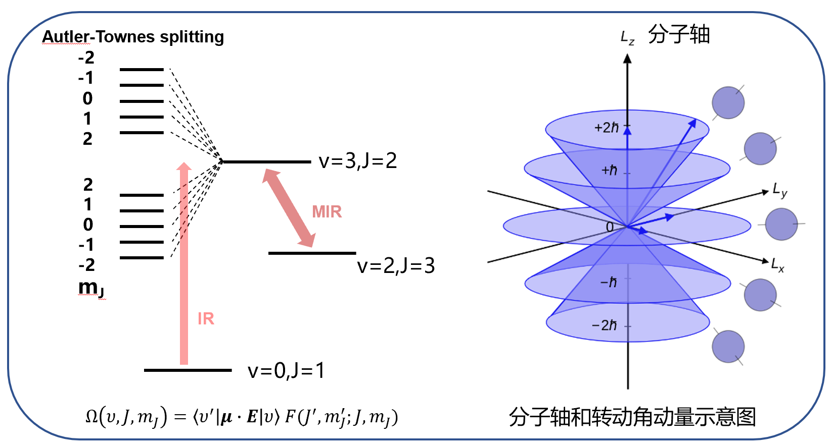 在分子振动量子态制备的基础上,我们还可以进行一些量子光学的拓展。如图3所示,我们用一束中红外光(MIR)和一束近红外光(IR)同时与分子作用,可以对分子取向进行主动调控,真正做到分子微观行为的操控。原理也十分简单,利用很强的MIR光、选择特定的分子能级可以分子产生很强的作用,此时分子的振动量子态会发生一种Autler-Townes分裂的量子光学效应,分子的转动态(J量子数标记)甚至转动子能级(MJ量子数标记)都会分裂成能量不同的分立能级,用另一束IR光就可以将分子制备(极化)到选定的子能级上。由于分子的MJ子能级代表着分子的转动角动量在分子轴上的投影方向,将分子选择性制备到特定子能级上意味着我们可以调控分子的角动量的投影方向,对分子微观上的空间取向进行调控。